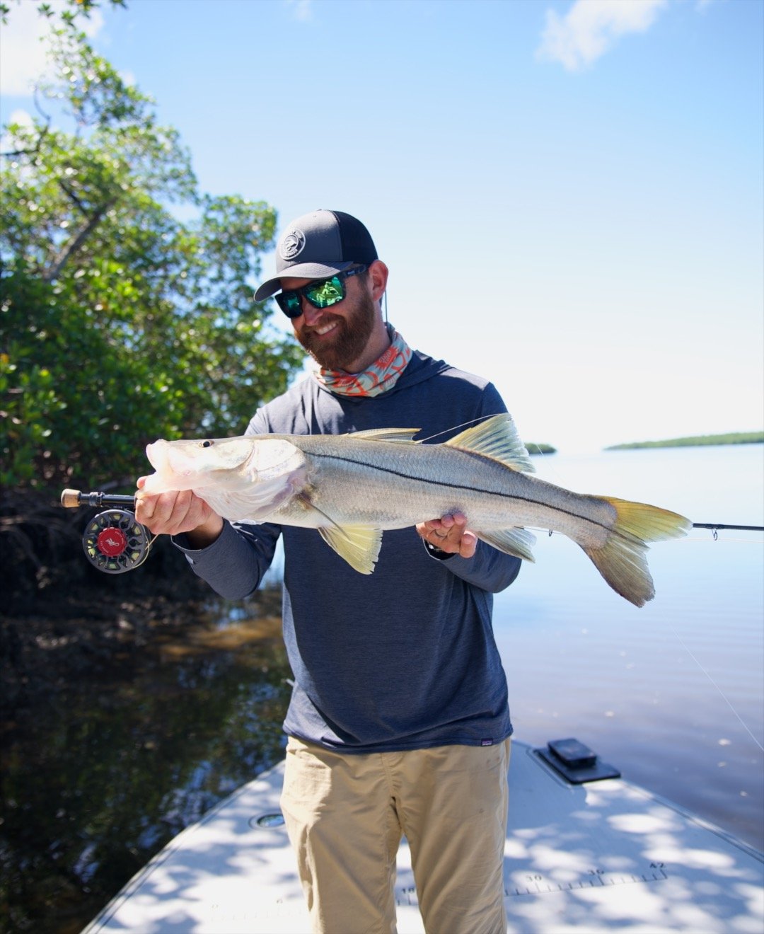 Both offer excellent opportunities for sight fishing with fly and light tackle, and the fishing spots depend on the season and conditions. In winter, we focus on the backwaters, where fish seek warmer shallow waters with dark bottoms. Spring and summer bring fish to the coastline, with lower winds and warm temperatures making for some of the best fishing of the year. This can lead to some incredible sight fishing opportunities along the beach, where Snook and Reds can be found cruising for their next meal.